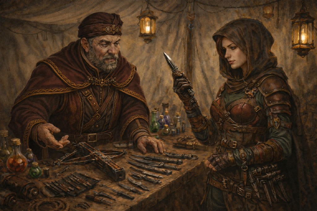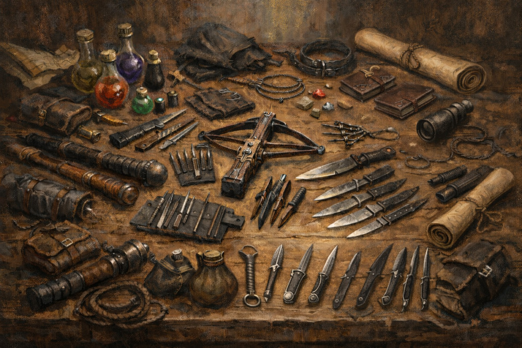 Werkzeuge, Spezialausrüstung und Versteckwaffen des schurkischen Handwerks stärken die Glaubwürdigkeit deines Charakters und erzeugen Anspielpunkte. Diese Gegenstände können verdeckt, aber auch offensichtlich getragen werden. Solche Gegenstände helfen dir auch, Tätigkeiten nicht nur zu behaupten, sondern auszuspielen. Diese könnten folgende sein:
