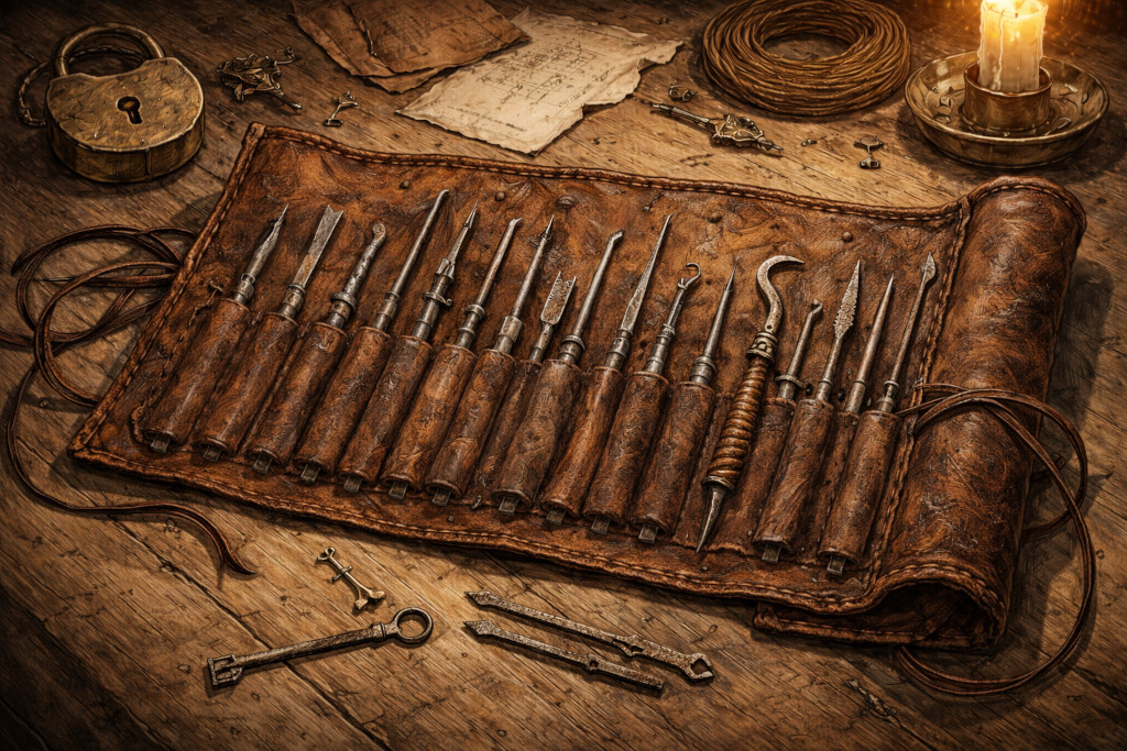 Es gibt viele verschiedene Arten von Dietrichen, doch für den Anfang braucht man nur drei verschiedene: Einen Haken, eine Schlange und vielleicht eine Rake. Wir empfehlen Dietriche zu besorgen, die etwas stabilere, breitere Griffe haben. Dazu sollte man 2-4 verschiedene Spanner unterschiedlicher Stärke und Größe haben. Dann braucht man noch einige einfache Übungsschlösser, dazu eignen sich günstige Vorhängeschlösser am Besten. Wir empfehlen für diese Ausrüstung eine kleine Lederrolle anzuschaffen, um diese kostbaren Werkzeuge sicher zu verwahren.